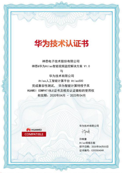 4月3日,神思電子智能視頻監(jiān)控方案順利完成華為技術(shù)有限公司Atlas人工智能計(jì)算平臺(tái)Atlas500兼容性測(cè)試,獲得了HUAWEI COMPATIBLE證書及相關(guān)認(rèn)證徽標(biāo)的使用權(quán),標(biāo)志著神思電子正式加入華為昇騰生態(tài),未來雙方將共同進(jìn)行智能視頻監(jiān)控解決方案的推廣,為行業(yè)客戶提供技術(shù)保證。