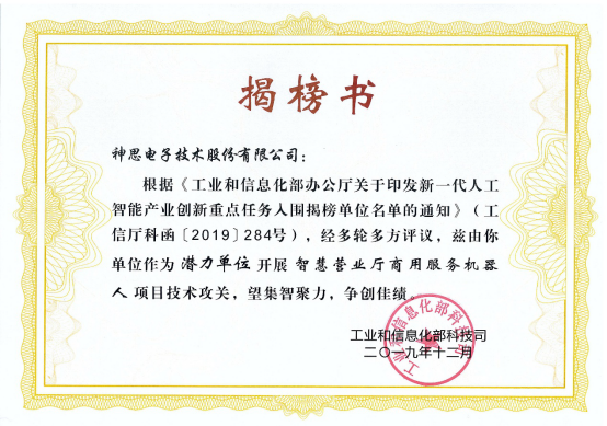 近日,工業(yè)和信息化部辦公廳印發(fā)“新一代人工智能產(chǎn)業(yè)創(chuàng)新重點任務入圍揭榜單位名單”,山東省共8家企業(yè)入圍重點任務榜單,神思電子獲批潛力單位,開展智慧營業(yè)廳商用服務機器人項目技術攻關。