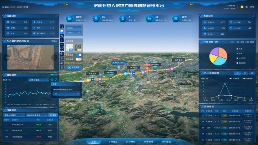 通過分布式光纖傳感實現(xiàn)7×24小時溫度與振動監(jiān)測,精準定位泄漏與第三方破壞,并與無人機自動聯(lián)動,光纖預警觸發(fā)后,無人機搭載神思智飛自主起飛至精確坐標,通過高清與紅外成像二次確認,有效過濾誤報并獲取現(xiàn)場實況,保障供熱管網(wǎng)安全穩(wěn)定運行。