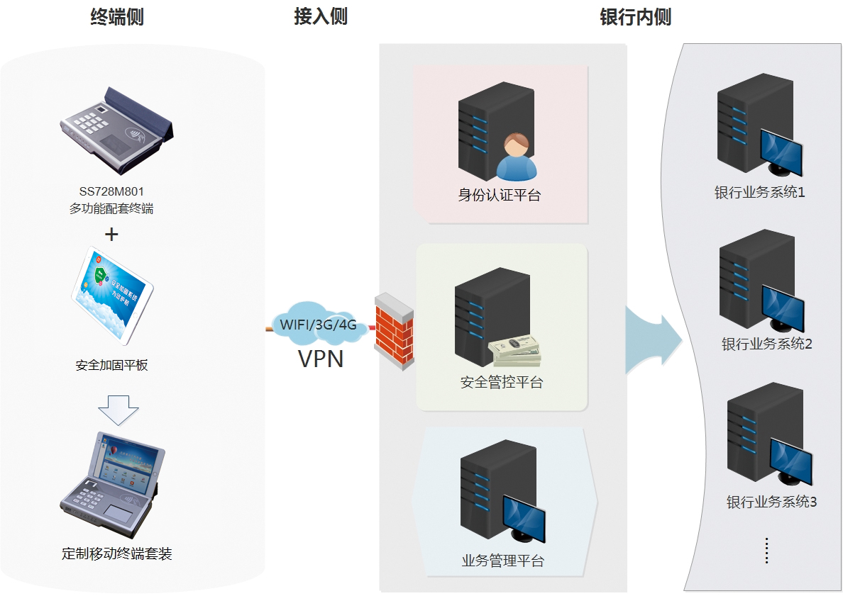 移動終端套裝+移動展業(yè)管理平臺。可以隨身攜帶的非現(xiàn)金銀行柜臺。